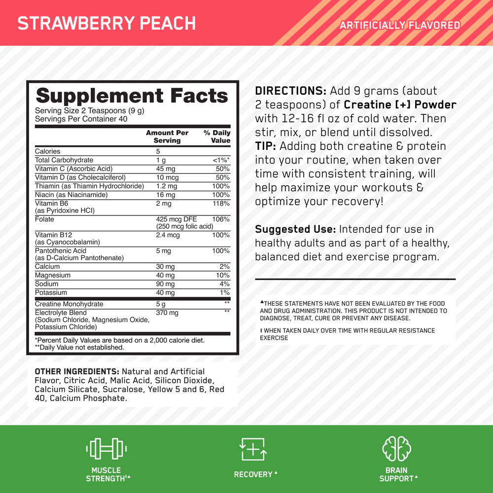 La mezcla en polvo de creatina [+] de Optimum Nutrition favorece la fuerza y ​​la recuperación muscular con 5 g de monohidrato de creatina por porción y proporciona apoyo antioxidante, cerebral, óseo y energético celular gracias a las vitaminas B, C y D. Además, cada porción aporta 370 mg de electrolitos para reponer los que se pierden con el sudor.